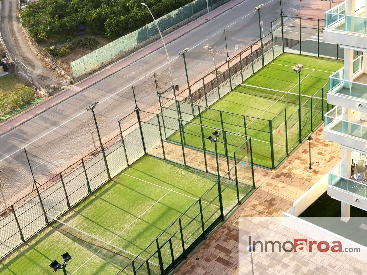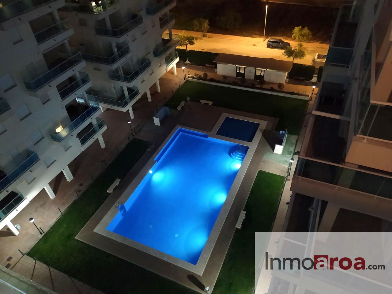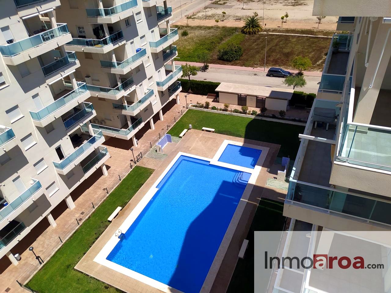 Dentro del complejo nos encontramos con una piscina comunitaria con zona de césped y unas 4 puertas de acceso al mismo.
