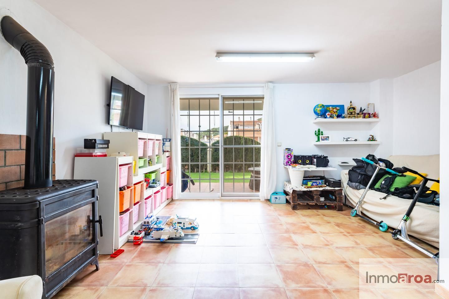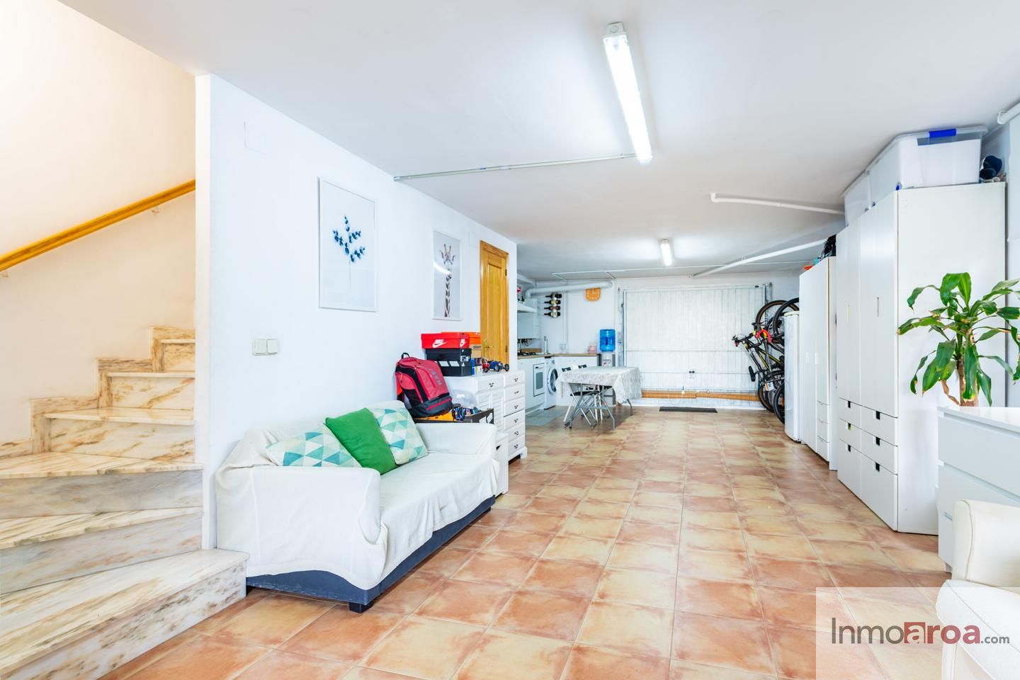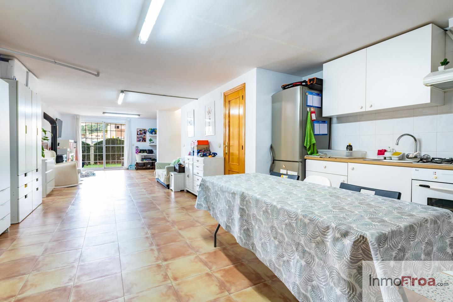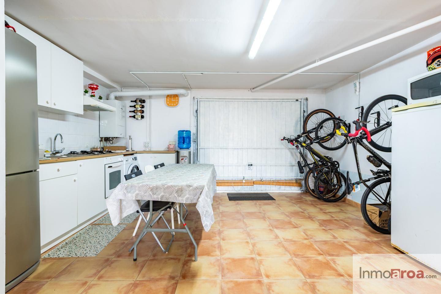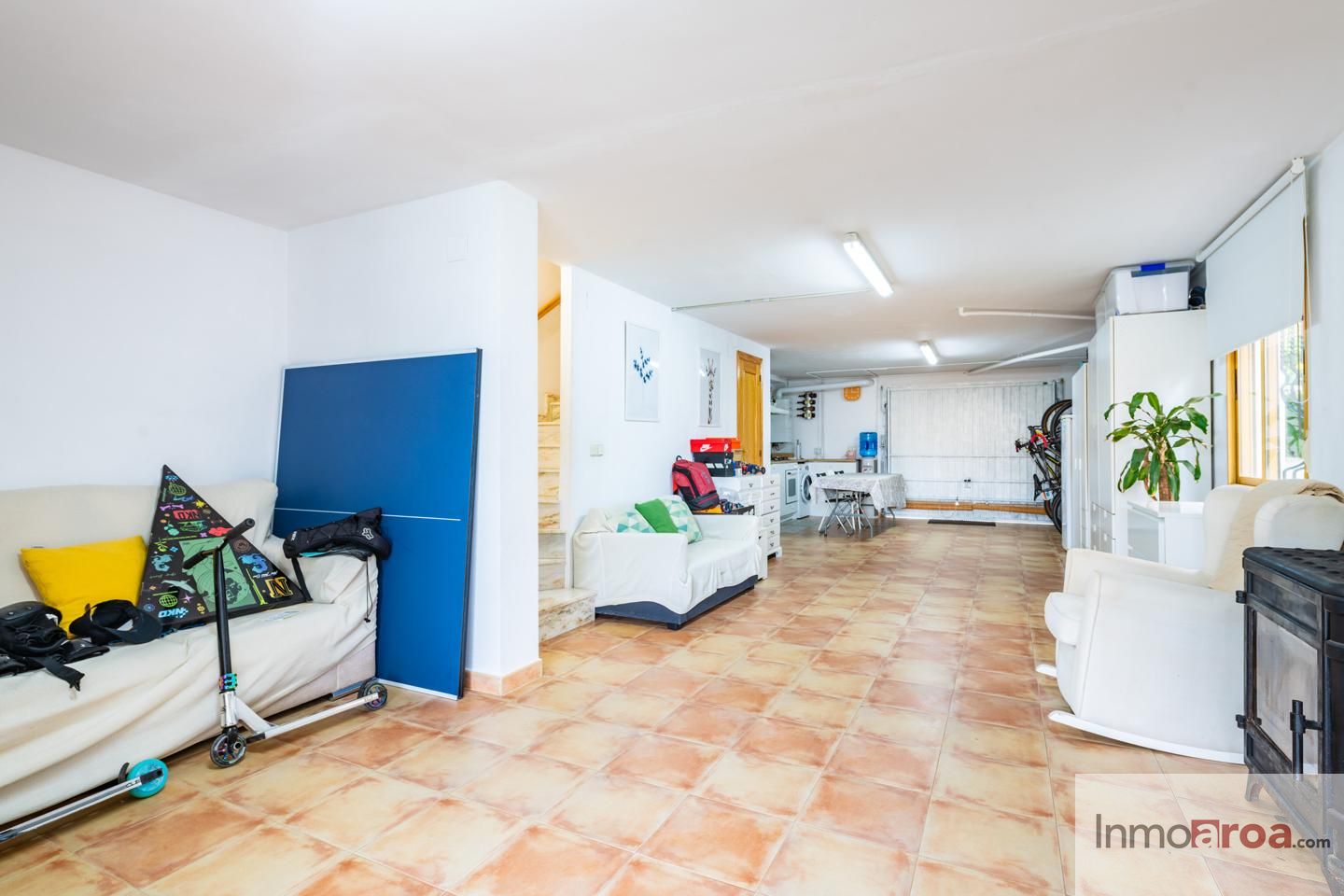 En la planta del garaje encontramos una agradable zona de estar con chimenea y cocina independiente, ideal como espacio multifuncional o como zona de ocio.